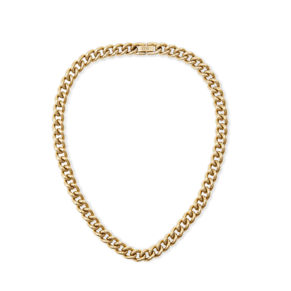 Questa massiccia collana a catena è un classico da indossare in ogni occasione, per valorizzare qualsiasi look. Ogni anello color oro è un gioiello imperdibile dalle dimensioni personalizzate, con filamenti su misura in fatto di larghezza, lunghezza e diametro. Dotata di chiusura a scatto e di una consistenza tanto raffinata quanto confortevole, questa collana è perfetta da abbinare ad altri accessori, ma è anche un meraviglioso gioiello da indossare da solo.