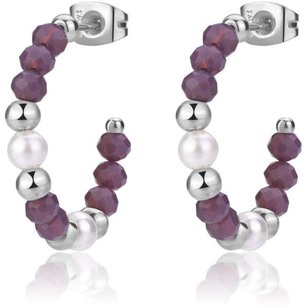 Orecchini a cerchio in acciaio 316L con sfere vetro viola e perle di conchiglia. Collezione GLINT.