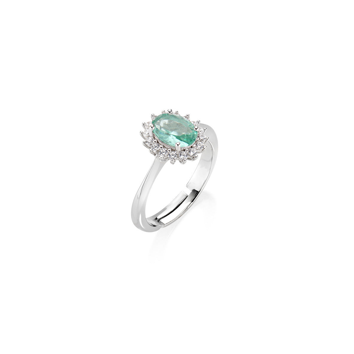 Anello regolabile donna Amen della collezione Lady in argento 925 rodiato con pendente e zirconi bianchi con pietra verde acqua sfaccettata. Misura regolabile da 16 a 20. Made in Italy.