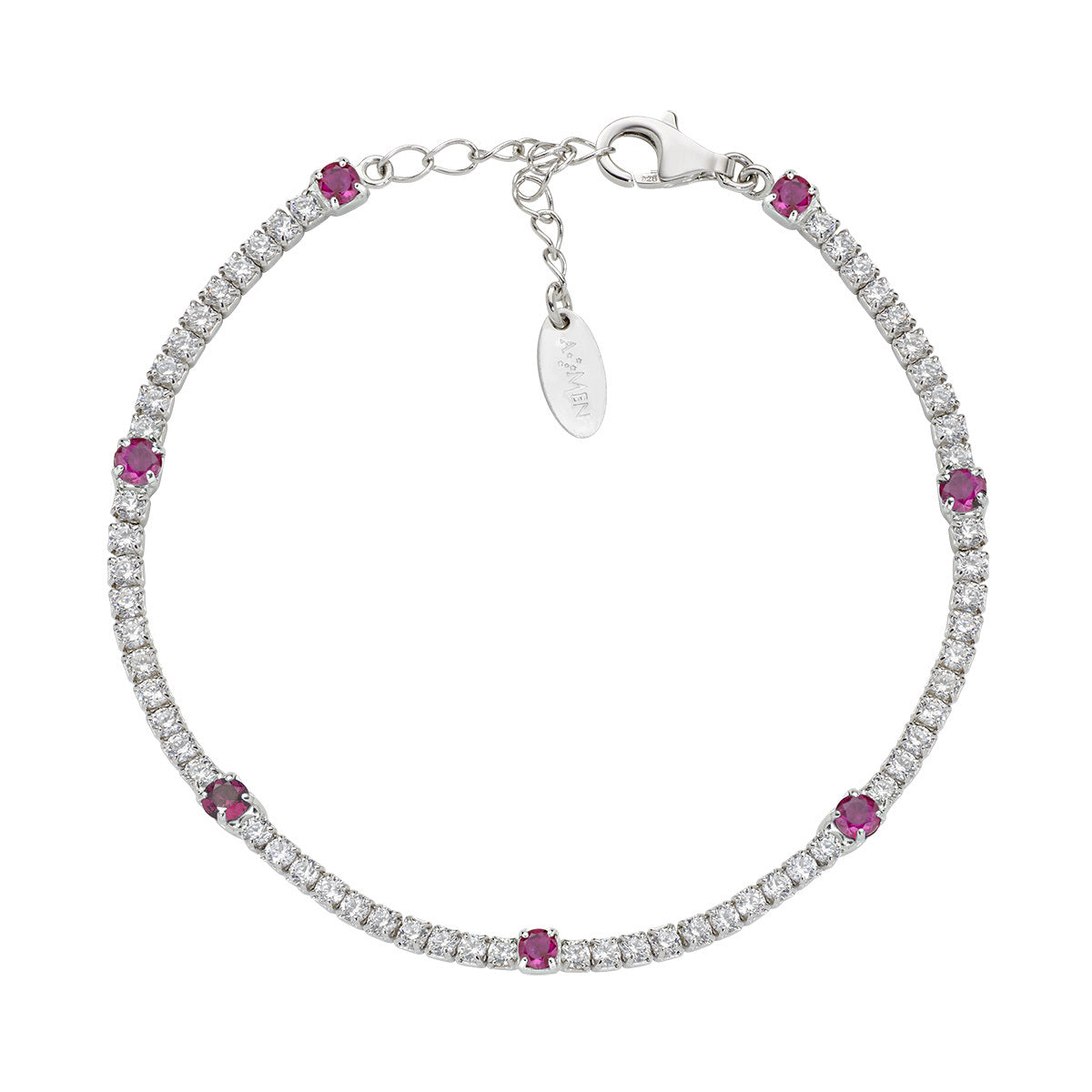 Bracciale tennis donna Amen in argento 925 rodiato con zirconi bianchi da 2 mm alternati a zirconi rossi da 3 mm. Lunghezza regolabile da 16 a 19 cm, chiusura a moschettone. Made in Italy.