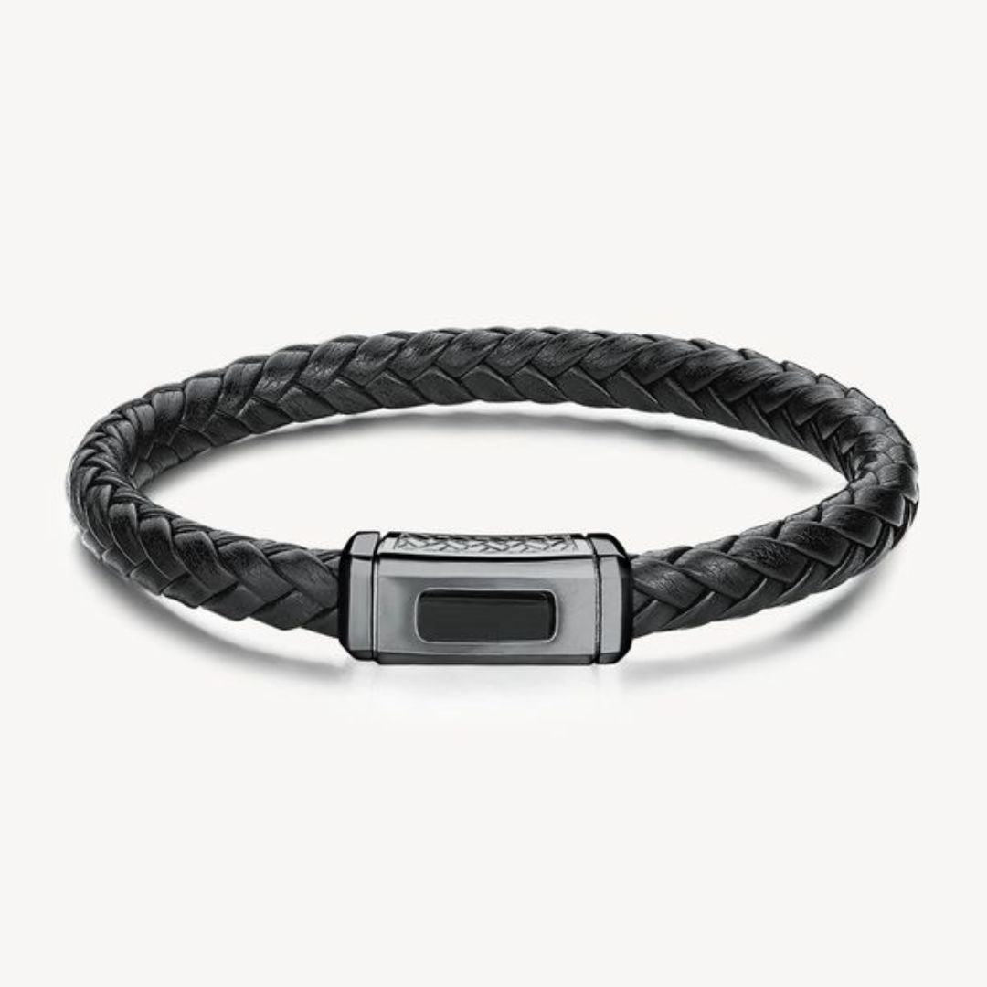 Bracciale in pelle nera con elementi in acciaio 316L e finiture pvd colore rutenio e pvd colore nero.