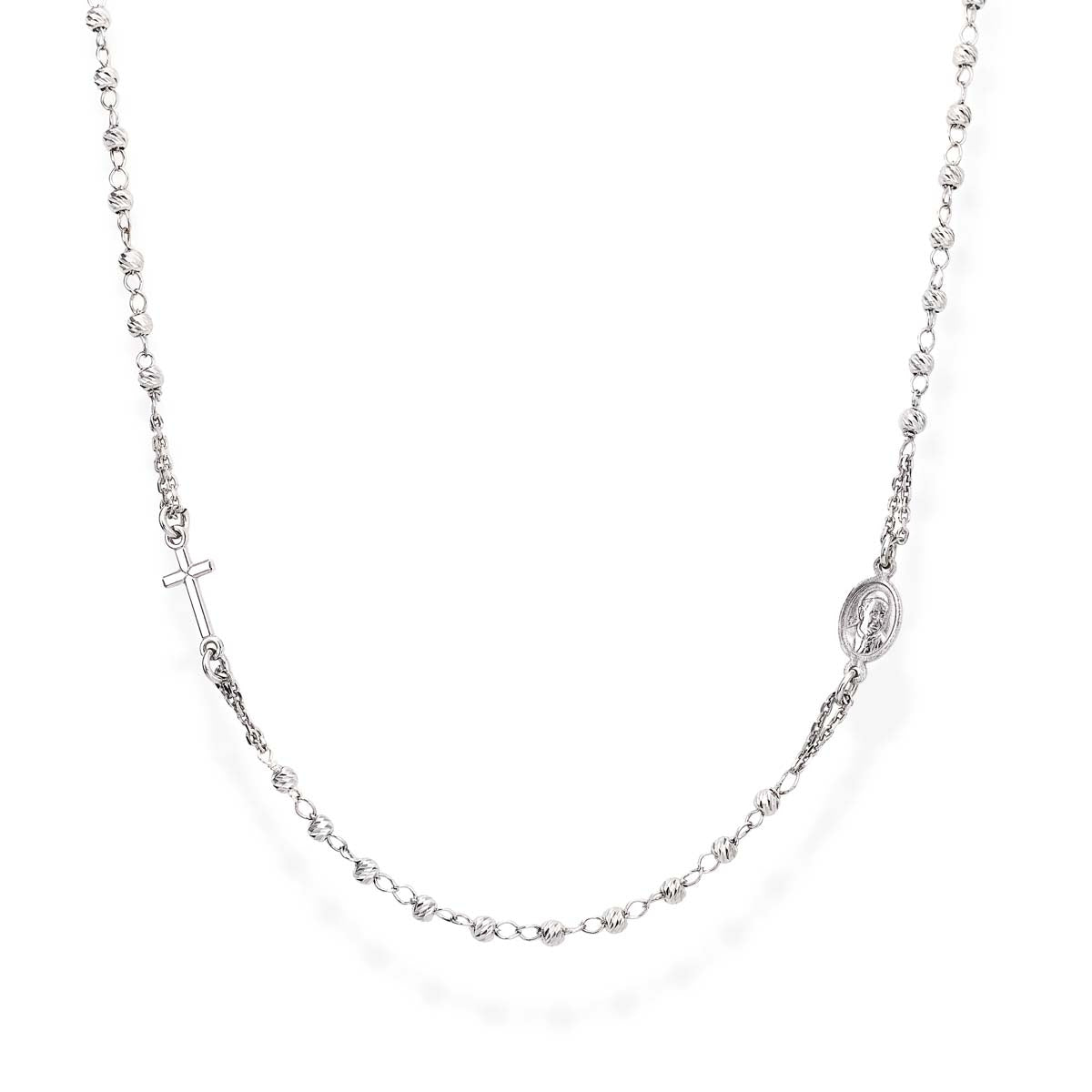 Collana rosario donna Amen della collezione Rosarium in argento 925 rodiato con cristalli beige/dorati, grani da Ø 3 mm, con croce e Miracolosa. Simbolo di spiritualità Made in Italy.