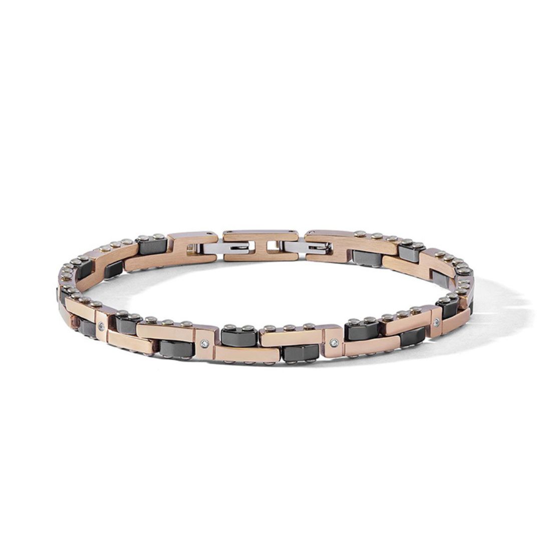 Un gioiello maschile dal carattere contemporaneo: bracciale rigido bicolore con inserti rosé. si distingue per la combinazione di elementi e colore. Da indossare in ufficio, nel tempo libero e nelle occasioni speciali. (Modello ubr1283).